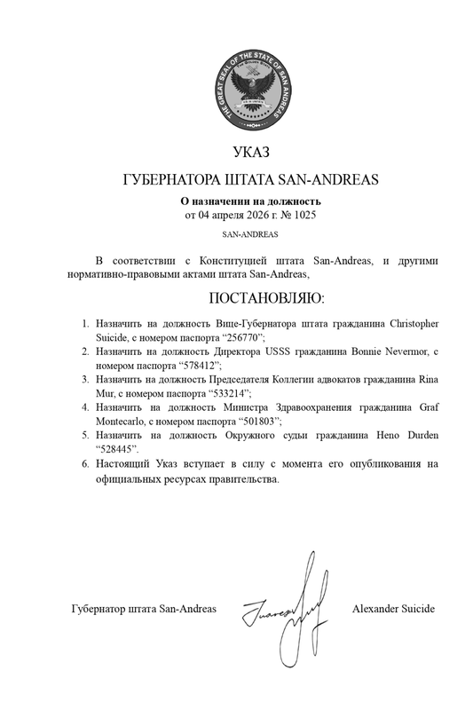 Alexander Suicide Губернатор Губернатор штата 20 Июн 2021 99 143 Сегодня в 03:16 #1,021 Указ №1025 О назначении на должность